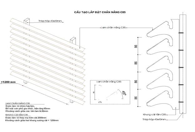 Hệ chắn nắng C85 là hệ chắn nắng mặt đứng cố định có độ nghiêng 45 độ, các lam có bản rộng 85mm, được liên kết với thanh xương cài C85, bề mặt được phủ sơn gia nhiệt PE với nhiều mầu sắc đa dạng, độ dài được sản xuất theo yêu cầu tùy theo thiết kế của dự án, sản phẩm có tính thẩm mỹ, có độ ổn định cao, hoàn toàn chống cháy và chống nước, không bị oxy hóa…