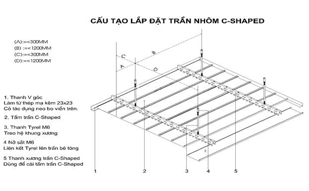 Hê Trần nhôm C-Shaped với các tấm có bản rộng 100mm, 150mm, 200mm, được liên kết với thanh xương cài C-Shaped, tấm trần phủ sơn gia nhiệt PE, sơn tĩnh điện với nhiều mầu sắc đa dạng, độ dài tấm được sản xuất theo yêu cầu, dễ dàng thi công lắp đặt, không yêu cầu dụng cụ máy móc phức tạp, tương thích với các loại đèn chiếu sáng, loa âm thanh, thiết bị PCCC, Camera… Sản phẩm có độ ổn định cao, hoàn toàn chống cháy và chống nước, không bị oxy hóa, hoàn toàn loại bỏ yếu tố xâm thực của môi trường.